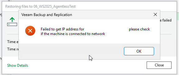 Windowsサーバのファイルリストアを試したところ、以下エラーが発生しました。
