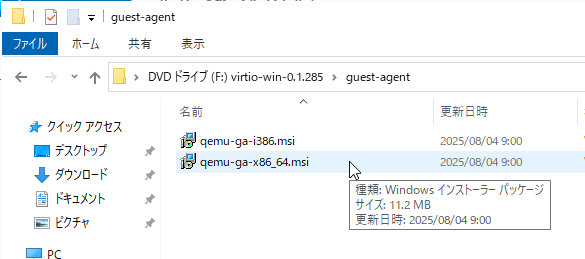 QEMU AgentはVM Essentials上でWindows仮想マシンを作成時、VirtIOドライバをマウントしていれば、フォルダ内のインストーラを実行してインストール可能です。
