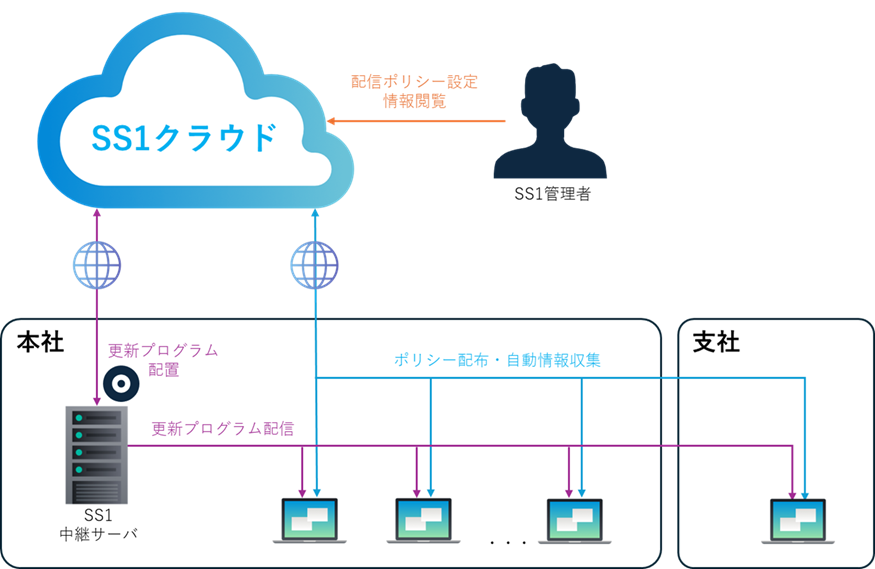 一般的なSaaS製品では課題になりがちな更新プログラム配信時の通信についても、SS1クラウドでは配信サーバをローカルに配置する構成が可能です。